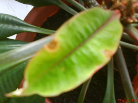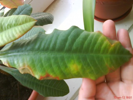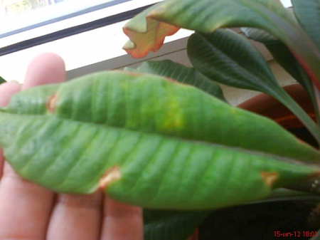 С верхними листочками какая-то беда. Подскажите,что происходит с цветком? Как ему помочь? Нижние листочки вроде в норме, только с верхними такая беда...