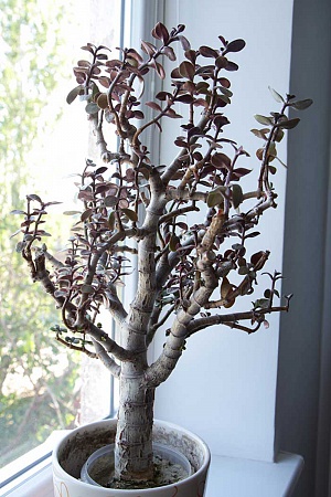 Есть у меня старая весьма толстянка, лет 15 ей наверное. Проблемы у нее начались еще года три назад, после переезда - листья обмельчали. ветки удлинились, позже я ее пересадила - стало еще хуже (на самом деле я не очень хороший цветовод. ну что делать...). Но в конце концов - этой зимой она почти погибла - все листья съежились и высохли, в чем причина - не знаю. При этом она не умирает окончательно - гнили нет, ствол вполне живой. Месяц назад выняла ее из земли, решила посмотреть на корни, и корней не обнаружила совсем. Решила укоренить в песочке. Теперь стоит она в песке. Верхние листья без изменений, но зато внизу ствола появились новые росточки.