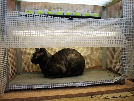 (тыквенных) ставлю. Всегда можно отрегулировать высоту полки просто положив на саму полку слой или два толстого пенопласта. На каждой полке по 5 ламп - люмок - по 18 Вт, на всю длину. Подкладывая пенопласт можно приближать или отдалять плошку от ламп, регулировать таким образом освещение и температуру. Сеять предпочитаю в большие плошки - ванночки для фото, благо сейчас многие стали расставаться с этими нужными в советское время вещами. Как раз получается по ширине входит 2 ванночки, по глубине все освещается лампами. Само освещение включается отдельными полками, у меня - 2 и 1. Несколько раз меняла варианты включения - под конкретные задачи. На теплице надет чехол из армированной пленки, прорезаны входы-дверцы для ухода за сеянцами. Чехол предохраняет посевы от пересыхания, от сквозняков и котов, которые, в отсутствие хозяев, свои морды суют куда попало.