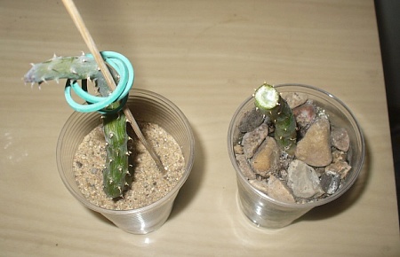 С ним все понятно: последний членик отломил и укоренил (укорененный членик в круглом горшочке, он уже новый, с листочками, нарастил).