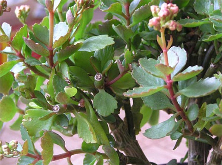 a-ka, Анна К., Москва - спасибо! Ирина, надеюсь, что все у Вас получится. Растения не цветут, иногда, не потому, что им у нас плохо, а потому, что слишком хорошо! Когда и тепла, и света, и питания много - зачем думать о цветении, надо ботву гнать! А когда стресс - день короткий, температура пониженная (зимой) или слишком сухо и жарко (летом), растение затормаживает свое развитие и "задумывается " о потомстве, о продолжении рода. И как только условия начинают улучшаться - растюшка начинает давать цветоносы! Конечно все гораздо сложнее, очень сильно меняется биохимия, запускаются каскады ферментативных реакций, но это удел специалистов. А нам достаточно такого "образного" объяснения. Екатерина, Я практически не опрыскиваю никакие свои растения, но регулярно, раз в неделю (летом) мою их горячим душем. Зимой мою только те, что растут в комнатах, на лоджии у меня "сонное царство". А цветки после покупки, как правило, быстро опадают или засыхают. Это нормальная реакция растения на перенесенный стресс - переход из оранжерейных условий к "суровой действительности". Обрежте цветонос, прихватив 1 пару листьев, чтобы не было пенька перед следующей парой листьев. Ранка подсохнет и из пазушных почек начнут расти 2 побега. Для размножения выберите сильные побеги с 4-5 парами листьев. Нижние листья оборвите и посадите черенок сразу в землю. Я из-за недостатка места сажаю в горшки к фикусам или кротонам,или родным каланхойчикам, короче туда, где есть свободная поверхность земли. Когда черенок укорениться и пойдет в рост, его можно отсадить в отдельный горшочек. Не жалейте обрезать и прищипывать каланхое - чем пышнее куст, тем обильнее цветение!
