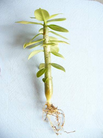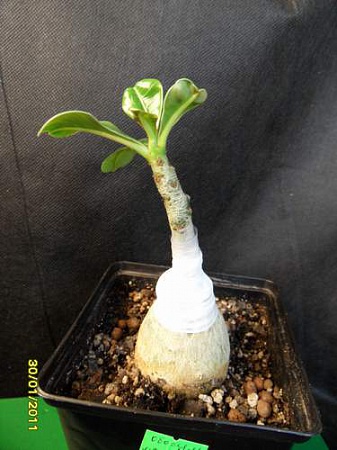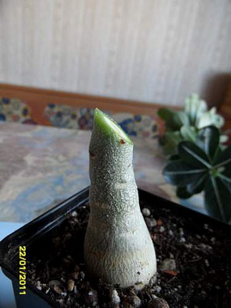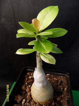 Вот на снимке сеянцу чуть больше 6 месяцев, а он немного потолще зубочистки, ни попки, ни особой корневой. И подумалось мне: что же будет, если его привить? Силы для роста ему даст подвой, а вариегатность сохранится? Берем этот сеянец и двухгодовалый не сортовой обесум(я недавно занимаюсь адениумами, у меня только один был постарше, который уже использован в прививке).