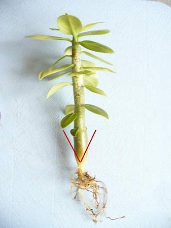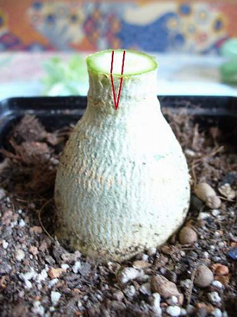 Кстати, ещё о V-вырезах...у меня на нек. тайцах привитых (из Сиамадениум в основном) если поразглядывать внимательно прививки- есть такие,где подвой был вырезан буквой V прям так,что верхние края "на нет" сходят к наружному диаметру...то есть как бы горизонтальной части "пенька" нет вообще...Пока, спустя пару лет у меня,это выглядит симпотично, а дальше поглядим...мне кажется, что так стоит делать, если подвой от мощного адениума, а привой от адениума более изящного, имеющего вообще не сильно толстые ветки(типа как у культивара Ма Ха Монгкол Еллоу)