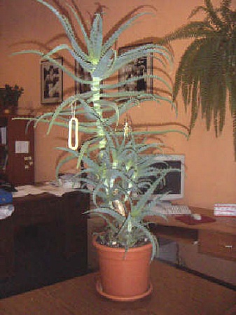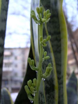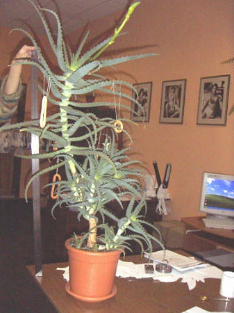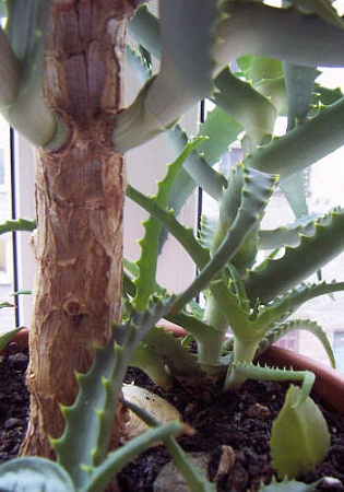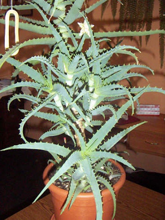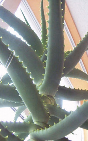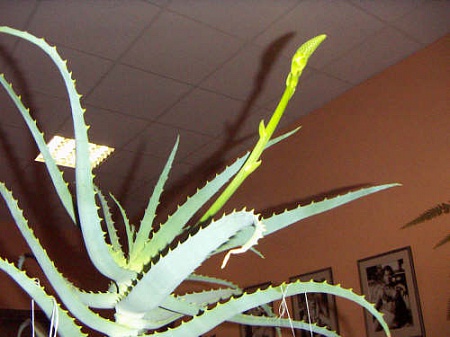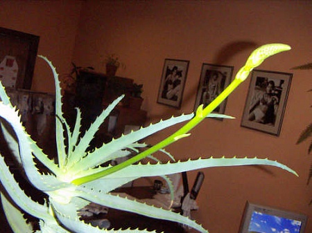 Смотрим все. На верхушке метрового алое ( мы его зовём Ванечкой, ему 6лет) цветонос длиной в 30 см., а на конце тугой бутон, как кукуруза. Так жаль, что kамеры не было у меня с собой... Но завтра непременно сделаю несколько фото и вечером выложу на форуме. А пока выкладываю фото алое-Ванечки сделаное в августе. Только подскажите, плз, можно растение переместить на короткое время фотосессии? Не повредит ли это будущему цветку? Боюсь испугать растение. А то ведь не дотянусь, т. к. Ваня стоит на подоконнике и добавте метр его высоты и 30см цветонос. А может завтра ещё длиннее будет?