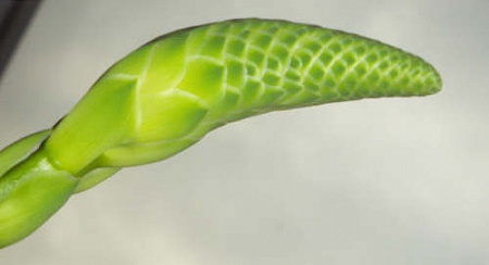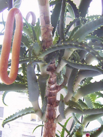 Прихожу на работу после выходных, проверяю все растения (a на верхушку алое взгляд не был брошен) и сажусь за компьютер и работаю часа два. И вдруг возглас коллеги: "Ой! что это за огурец на Вашем алое?"