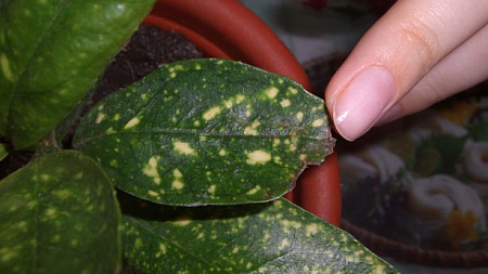 деформированный...Я давай обсматривать, ну нашла эти пятна красномалиновые.Еще вспомнила что недавно один нижний лист пожелтел и отпал. Точно не ржавчина, на щитовку не похоже,паутины и налета нет. Помыла мыльным раствором побрызгала инсектецидом (у нас в городе сложно с препаратами для растений все что есть из инсектецидов "agrecol anti-szcodnik", К примеру на вопрос о фитоспорине, продавщица спросила что за ругательство