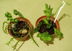 В прошлый раз пыталась укоренить этот же молочай в песочно-кирпично-вермикулитно-земляной смеси, он дал корешочки и новые маленькие листики, но потом постепенно засох: то ли недоглядела - пропустила полив, то ли слишком длинный был череночек.