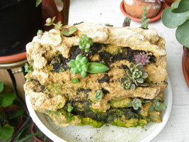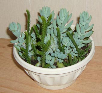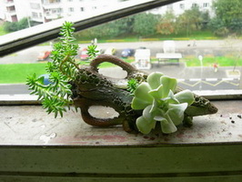 Ещё одна плошка. Какой-то рогатый монстр. Крассулы надоть обрезать что ли... да и остальных расросшихся либо отсаживать, либо укорачивать...