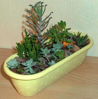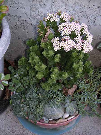 В первой плошке два голубых посадили рядом, и они с камнями сливаются, камни рябят, нужно что то более нейтральное и не такое крупное. Пахифитум старайтесь руками не трогать, налет снимается. Они отлично смотрятся на фоне песка, и мелкого гравия. Керамические горшочки - отпад! Я бы из правого садика посадила что нить желтое или пестрое в левый, а одно голубое из левого в правый
