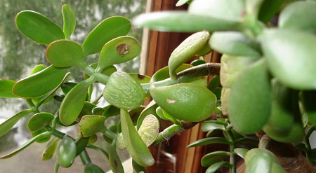 Денежное дерево (толстянка древовидная). Стоит у меня уже давно на подоконнике (Ю-З). Поливаю раза 2-3 в неделю средне. Все нормально уже года 2 росло хорошо. А вот теперь что-то с листьями начало происходить. Во-первых, некоторые листики начали сморщиваться, чахнуть. А на некоторых какие-то коричневые поражения образуются. Прикладываю фото. Помогите, пожалуйста.
