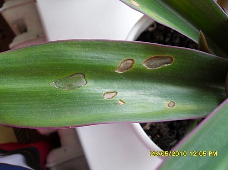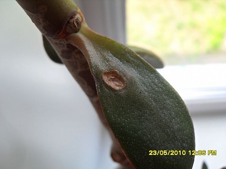 Здравствуйте! Помогите, пожалуйста, определить что это за "высохшие" пятна появляются на рэо. И ещё на толстянке похожие появляются, а потом лист становится вялым, желтеет и опадает. Отпало уже больше половины листьев. На макушке листья хоть и зелёные, без пятен, но какие-то подвяленые.