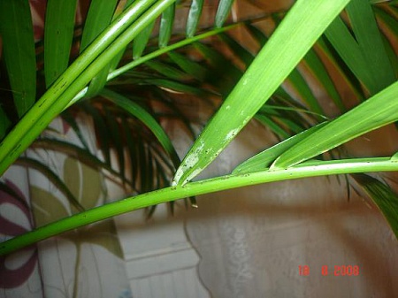 на нескольких листьях появился белый налет что-ли,но он не стирается и черные крупинки. Если их вытерать стволы мокрой ваткой,то крупинки достаточно легко смываются.Расти стала моя пальма плохо,ни как раньше,она у меня уже 3 года. Мало новых листьев и какие-то они квелые.Листья нижние сохнут Подскажите плз,что с ней такое?