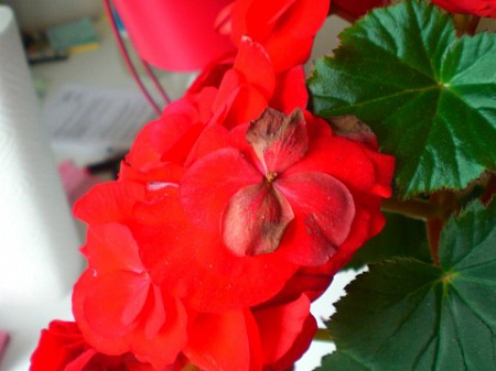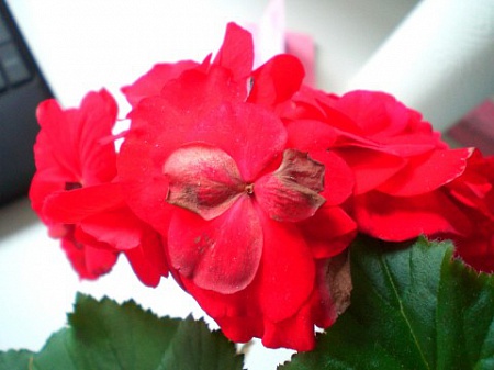 Примерно 3 недели назад стала замечать, что цветки начинают покрываться коричневыми пятнами, пятна сухие, они появляются сперва на кончиках лепестков, затем распространяются ближе к центру цветка, потом цветок опадает сам или от моего прикосновения. Каждые несколько дней я очищаю бегонию от таких ослабших цветков, к ним стоит только прикоснуться-и они опадают. Вот как выглядят больные цветки (см.фото)