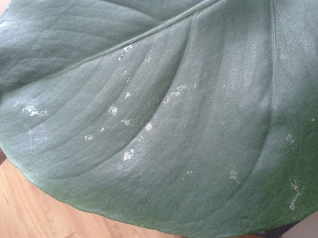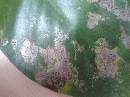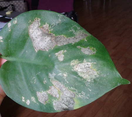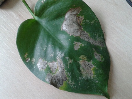 Добрый день, Две недели не было в офисе и за это время на монстере появилось вот такая беда (см. ниже фото). На соседних листьях монстеры - махонькие светленькие точечки, плохо видно, но мне показалось, что одна из них ползала:oops: