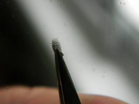 Всем добрый день! Купила я недавно цветущую орхидею в магазине, где они стояли тремя забитыми стеллажами. Выбирала самого незадохлика. Поставила на застекленный балкон. Там уже стояли 4 такие же орхи, только они цветоносы начали наращивать. Через 3 недели после покупки в как-то присмотрелась к цветку "новичка", а оттуда! Торчат два уса белых! В самой-самой серединке цветка, где "пипка". Его так и не заметить! Взяла я пинцет и вытащила такого монстра!