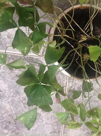 Добрый день! Пожалуйста, помогите понять что случилось с кислицей. Уезжали всего на 4 дня, растение было в полном порядке. Приехали, все растение покрыто белыми пятнами и сохнут листья. Ничего не меняли, растение стоит на окне уже несколько лет, не пересаживали, новые удобрения не использовали, полив раз в 3-4 дня. Рядом стоят ещё растения, они в порядке.