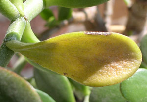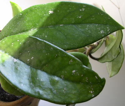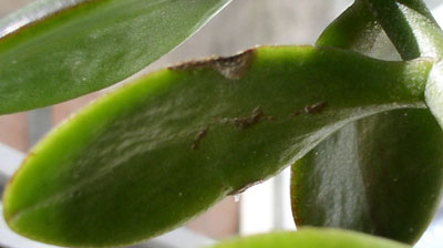 Началось все с толстянки, вначале на ней появились "сухие" точечки, которые "выедали" лист (см. фото), листики опадали. Но на растении не было обнаружено никакой заразы, писала сюда в форум, но определить причину не удалось, потом начали заболевать соседние растюхи, на листочках которых начали появляться дырочки, на Хойке - пятнышки... Кто-то может сказать, в чем, собссно, проблема и как спасти растения?