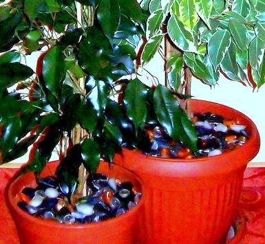 Ракушки, мрамор, морские камушки - это как-то не совсем то, что любят растения. На растения благотворно влияет смесь рубинов, аметистов и изумрудов. Если горшок с растением у вас стоит на солнечной стороне, то нельзя посыпать сверху землю в горшках крупными алмазами - возможен солнечный ожог корней. И самое главное - помните, что от полива на камнях образуется известковый налет, что очень портит внешний вид камней. Не забывайте их периодически очищать смесью соляной и азотной кислот.