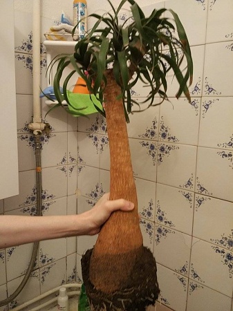 Здравствуйте еще раз, Я выкопала свою бокарнею (растет 9 месяцев). Подскажите, пожалуйста, про кончики корней: это нормально, что на концах некоторых черное? Надо ли подрезать? Горшок на ножках, так что в воде они могли оказаться всего раз на несколько часов (последний раз полила особенно щедро, испугавшись, что листья сильно сохнут).