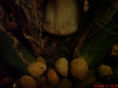 Так как все корни в порядке (не нашел НИ ОДНОГО гнилого, мягкого, скользкого или черного корня), то я подумал, что пожелтение у шейки ствола может быть связано с тем, что после первой пересадки (месяц назад) эти места оказались под землей. При вчерашней пересадке я проследил, чтобы шейки этих стволов остались на свежем воздухе, и таким образом процесс гниения будет остановлен. Тем более, что по совету Andrew Geser, Пальмусу устоен "сухой закон" на трое суток для дополнительной подсушки корней в едва-едва влажной земле.