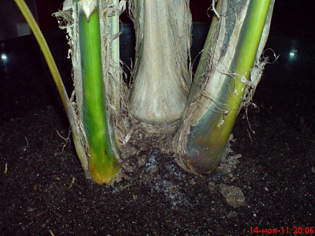 И еще - листья пальмы, как и листья любого растения, даже вечнозеленого, не вечны. Засыхание листьев еще не означает смерти растения, а только включение режима экономии. Главный жизненный орган растения - это корень. Главная часть корня - точка сопряжения с шейкой растения. Если растению не хватает сил содержать крону и разветвленную корневую систему, оно жертвует листьями и периферийными корнями.