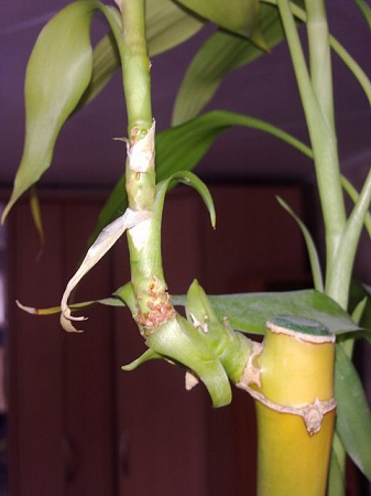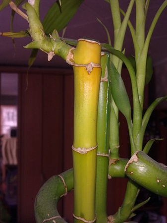 Здравствуйте! Подскажите пожалуйста! Имеется счастливый бамук(палка со спиралькой из букета). Уже четыре споловиной года. Основное растение разраслось. От корня основного растения выросло 4 уже больших побегов. От ствола тоже имеются отростки. Вопрос 1. На 2 побегах от корня которые, стали желтеть и сохнуть листья от кончика к стволу. Подкармливаю. Стараюсь не пересушивать землю. Что делать от желтения? 2. Имеются корни близко к поверхности земли - что с ними делать или не трогать?