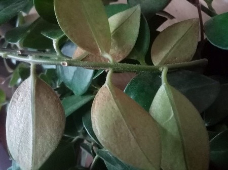 Здравствуйте. У меня проблема с листьями Эсхинантуса Мона Лиза. Верхняя сторона листьев хорошая, а вот на нижней не пойму что. Фото прилагаю. И ещё вопрос по Эсхинантусу Лобби.... сегодня утром заметила что у него с концов веточек капает вода, как у Алоказии. Но разве Эсхинантусы что то выделяют? Спасибо за ответы.