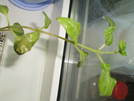 Marlin, Что-то белые точки на листиках- там не белокрылка часом живет? Или качество фото?..Если вредителя нет, то на мой взгляд черенок растет в условиях излишнего тепла и отсутствия нормального освещения.
