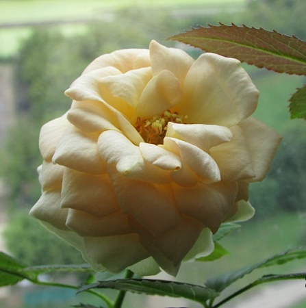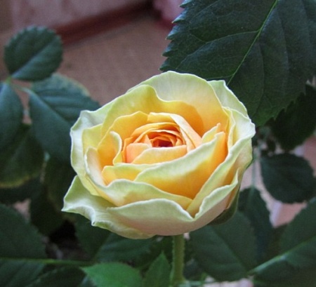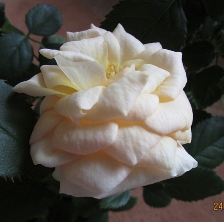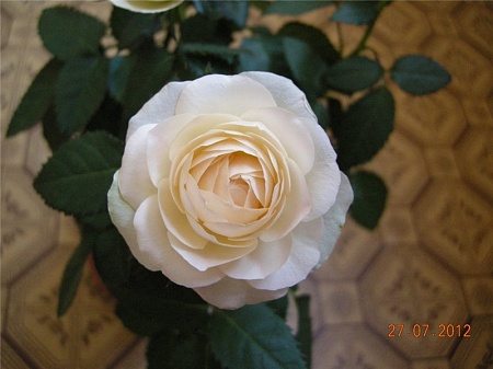 Отличная роза- коренастая, с короткими толстыми ветками, жестким листом, невкусным для клеща и большой розой... Желтоватые крупные лепестки по краям розовеют, аромат абрикос.