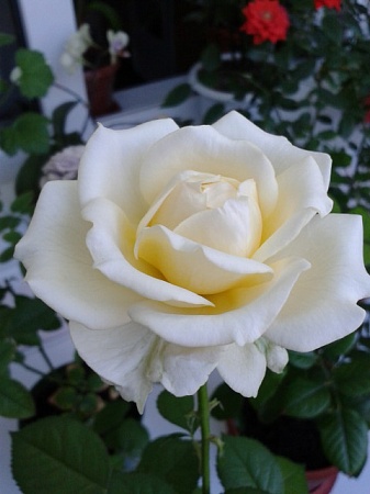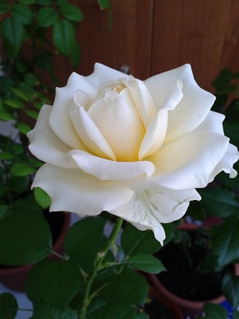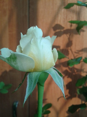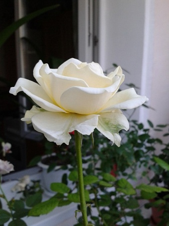 Одна только и цветет, опишу ее, может кто в ней свою признает и назовет ее. Приобрела четыре года назад как белую с зеленой каймой на листьях, дома кайма исчезла, проявляется только зелеными жилками на первых листочках, зато серединка стала какой-то лимонной. Розочка не тугодумная, но бутон очень долго зреет, склонна к слепым побегам, не любит пересушку грунта, сразу нижние листочки желтеют. По форме листочки округлые, бутон тоже как помпончик, шипастая, но цветок держит очень долго, серединка не открывается, всегда прикрыта лепестками, при роспуске характерно первый лист вот так отгибает.
