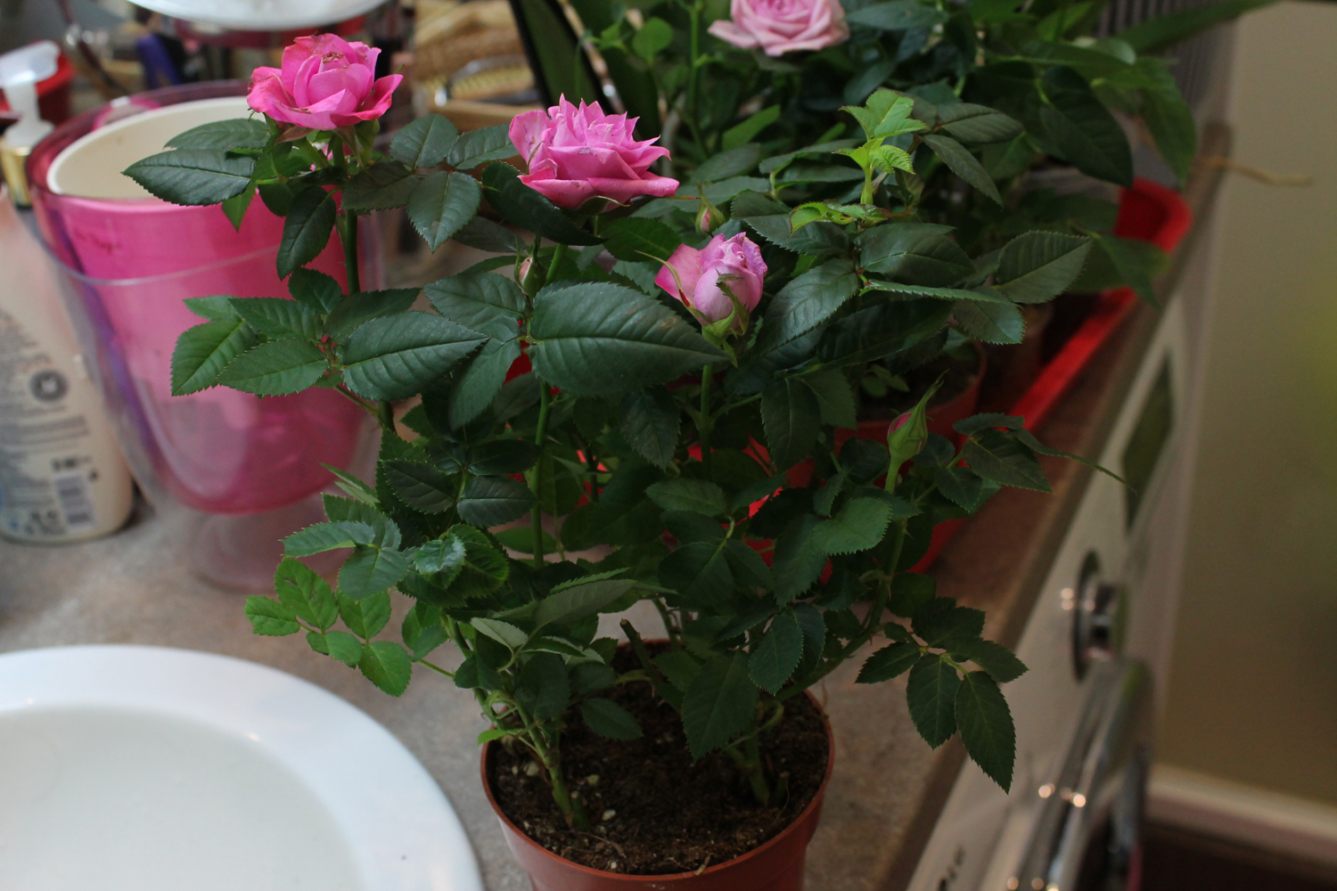 Первая вроде похожа на Фламинго, но... Фламинго я хорошо знаю, и она там тоже была. Если их поставить рядом, то видно, что разные сорта. К тому же моя Фламинго совсем без шипов, а эта с шипами. Вторая даже не знаю, кто. Тоже Де Рютер, а значит, опознать так просто не получится. Сегодня муж вешал новую полку, ну а что делать, жена опять сошла с ума