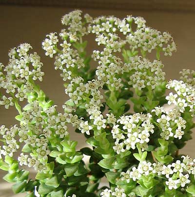 Crassula ovata = c. portulacea = c. argentea, это синонимы. По современной классификации - ovata. А форма, как у же говорили, monstrosa. Голландцы и пр. прдают такие крассулы под названиями "Gollum", "Hobbit" и "Horntree". Вот тут они все есть: (не знаю, чет ссылка не вставляется). Я, честно, не понимаю, чем они друг от друга отличаются. Может, окраской? По поводу цветения - никогда не видела и не слышала. Но вот у кактов монстрозные формы, как правило, не цветут. Может, это и на суккуленты распространяется?
