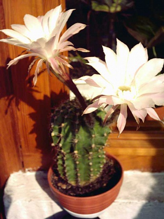 Nat (МО) пишет: Какой-то эхинопсис и какое-то алое. Если полосатое - значит, A. variegata. По форме роста похоже не него, окраску не видно.