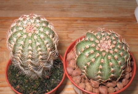Олег, проводила я такие эксперименты. Не от хорошей жизни, конечно, а оттого, что солнечных мест на всех не хватает. Поэтому из сеянцев отбираю обычно 2-5 для "загара", а остальным солнышка достается значительно меньше (2-3 часа в день, по очереди). Эти остальные отстают в развитии, поверьте, хотя в остальном получают то же самое, что и первые. И стебельки у них не такие компактные, и колючки послабей, и зацветают (в лучшем случае) на сезон позже. На приведенном фото одновременно снятые и укорененные детки одного эхиноцереуса. Левая росла прошлый вегетационный сезон в полутени, а правая на ярком солнце. Как видите, это столбик и шарик. И у левого заметны внизу пушистые ювенильные колючки, тогда как у правого сразу после попадания на солнце пошли "взрослые".