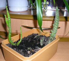 Слева жестоко замучанная от недостатка света, зверски потянутая Austrocylindropuntia subulata. Справа не менее жесткоко мучающаяся Mammillaria видимо gracilis (толком не видно).