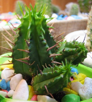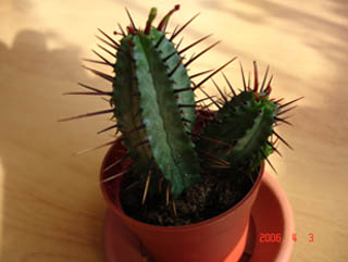 Abaent, это либо эуфорбия ферокс (ferox), либо энопла (enopla). Насколько я знаю, различаются они между собой количеством ребер, цветом колючек - у эноплы они темно-вишневые, и еще у фероксы стебель вроде покруглее.
