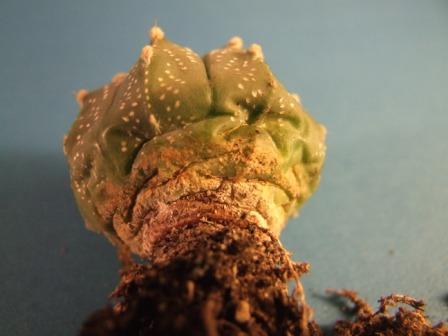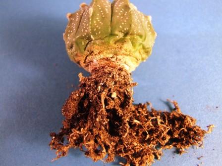 Нормальный зимующий астрофитум. А вот почва у него на корнях ацтойная. Погрубее бы и попористее. Посадите и поставите на зимовку без всяких поливов. Если хотите надуть - то в тепличку и полить, только это лишнее, если есть где зимовать.