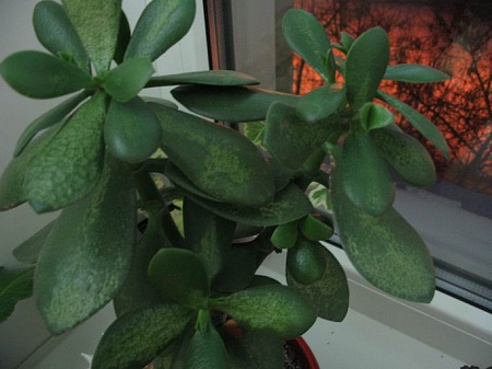 Уважаемые специалисты, помогите определить, что с толстянкой происходит. Примерно за неделю или две все листики со стороны окна стали подсушенные и в странную точку, а со стороны комнаты нормальные. Что это может быть и как лечить ??? Очень жалко, если пропадет растение