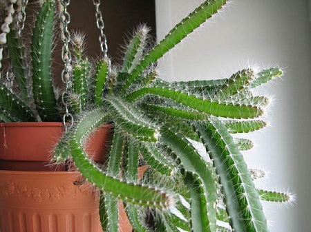 Всем добрый день! Помогите, пожалуйста, определить название кактусов. Первый с острыми извилистыми ребрами (20 шт) и белоснежными пушистыми ареолами в верхней части. Иголки радиальные почти прозрачные (ок. 16шт) от 0,5 до 1,0 см, центральных по 4 шт (около 1 см)- коричневатые. У второго по пять ребер. Активно ветвится и выпускает короткие воздушные корешки. Иголки мягкие.
