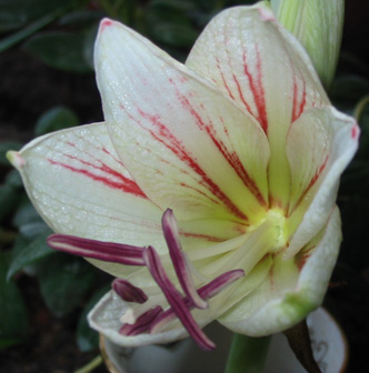 Я думала, что она "рыжая - обыкновенная", (других там не было) а получилось...что получилось, причем сомнения по поводу ее цвета начались когда стали вылезать бутоны, всего 2: они были зеленые, хотя обычно видно уже какого цвета будет цветок. Потом, и без того маленькая луковичка стала худеть и цветонос я срезала. Может сил на пигментацию не хватило?