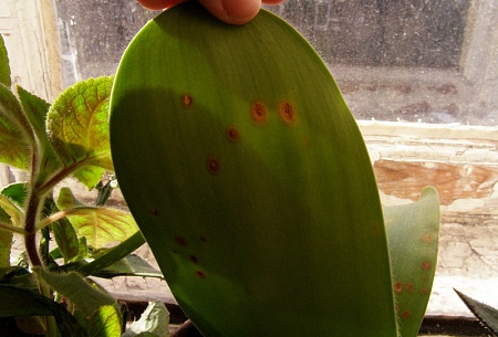 На листьях появились вот такие круглые, как бы ржавые пятна, новые листья из пазухи не появляются + края словно сохнут.