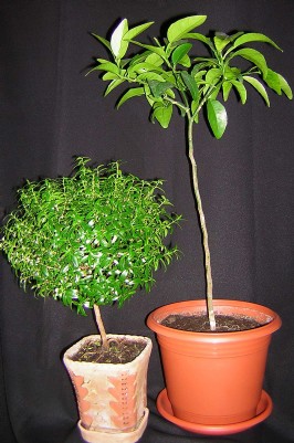 Вот фотка моих штамбиков. Мандарин - сеянец, ему полтора года. На цветение и тем более плодоношение не рассчитывала вообще, просто хотелось цитрусовое деревце. Запах листьев обожаю! (фотка ужалась неудачно, миртик смазан получился )