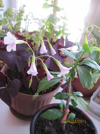 Проснулась и зацвела кислица, а справа от нее кинулся в рост гибискус шизопеталум (Baffi, тоже ваш! ).
