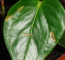 А Вот и проблемы!!!! У него почему-то (у Антуриума) на листочке и на одном цветочке маленькое черное пятнышко! Причем на листе как корочка с двух сторон, а на покрывале (цветке) только с внутренней стороны и и кончик черненький!!
