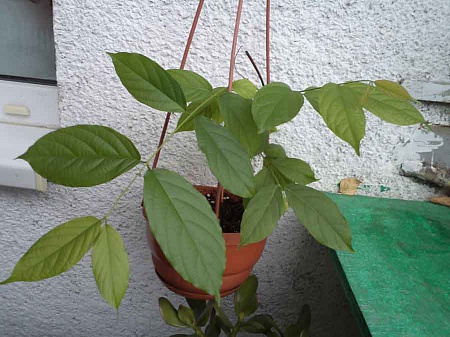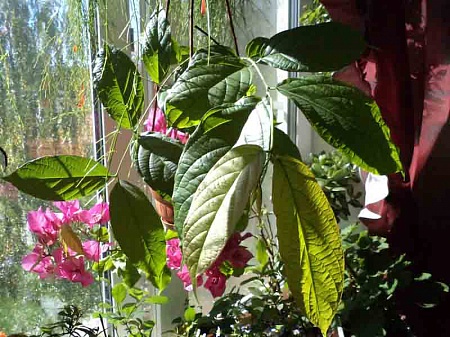 У меня тоже наконец-то эта растюха появилась. Укоренила в воде одревесневший черенок в течении апреля. Сначала рос как-то слабо и веточки отсушить пытался, а после перевалки в больший горшок попер как сумасшедший. Листья лопухастые и очень красивые. Выглядит ампельно, т.к сидит в подвесном кашпо. Южное окошко, полив, подкормка. Пока проблем нет. Отрастил только две ветки, третья коротенькая. Знаю что на зиму может скинуть листья. Вот думаю, может ему досветку сделать тогда?