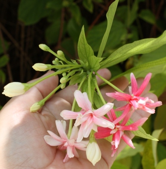 Красавица QUISQUALIS INDICA DOUBLE, китайская комнатная жимолость. Очень интересное растение. Я его приобрела еще 3 года назад. Она у меня все пыталась умереть, потом начала расти. И во, наконец, произошло чудо, и я увидела, как она цветет.
