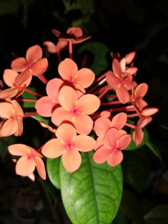 Иксора (без названия), цветет крупными оранжево-красными шапками, по мере взросления цветка меняет цвет лепестков, крупнолистая .