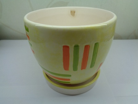 6. Не использовавшийся керамический горшок с поддончиком – 120 руб., на внутренней стороне небольшой скол глазури, на фото заметен. Высота 15 см, верхний диаметр внутри 12, нижний 8,5