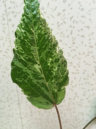 Hibiscus var. cooperi Carnival. 3-х цветный сорт, очень яркий при хорошем освещении. У меня стоял в тени и молодые листья почти без вариегатности. На солнышке легко восстанавливается окрас. Цветы с длинным "носиком". Взрослый, хотел поцвести, но я решила его подрезать для формы. 500 р.