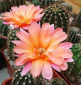 Кактус шаровидной формы, зацветающий в достаточно молодом возрасте. Эпидермис тёмно-зелёного цвета, колючки ничем не примечательны. Цветок оранжево-розоватого цвета. На широких лепестках заметны разводы, штрихи цветовых оттенков. Продаётся неукорененная детка 1,8 x 2,3 см - 550 р